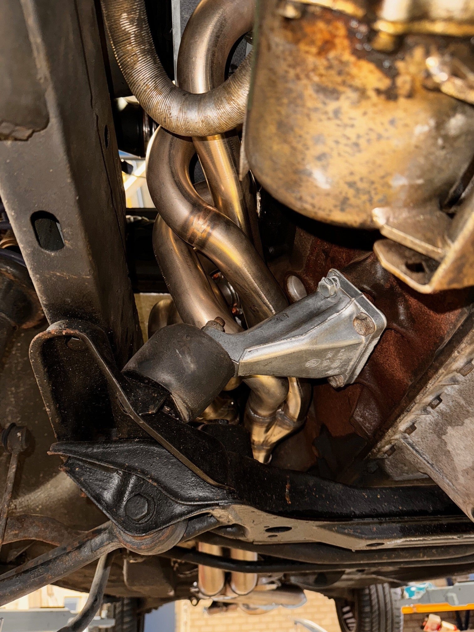 Complete RVS uitlaat, inclusief "spaghetti spruitstuk" en aangepaste motorsteun, gemonteerd (ca. 35 PK winst)